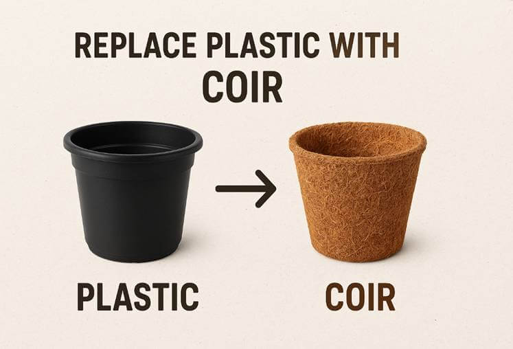 Every day, millions of coconuts are consumed across India. What happens to the husks? Most are dumped in landfills, clogging drains, or burned, causing pollution.Coir is always a better choice over plastic because it is natural, biodegradable, and eco-friendly. Unlike plastic, which takes hundreds of years to decompose and causes long-lasting pollution, coir is made from coconut husk, a renewable and sustainable resource. Coir products such as pots and planters not only reduce waste but also improve soil health, as they allow roots to breathe and can be planted directly into the ground without harm to the environment. By choosing coir over plastic, we not only support sustainable living but also contribute to reducing plastic pollution and protecting our planet for future generations.