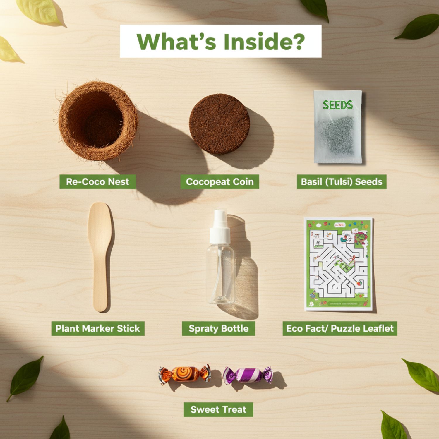 Turn every occasion into a green celebration with Re-Coco Mini Magic—a compact DIY grow kit designed for kids, beginners, and eco-friendly gifting. Each kit includes a Re-Coco Nest Seedling Cup (2-inch), Re-Coco Mitti (coco peat coin), basil seeds, and a chocolate treat—making it both fun and thoughtful.