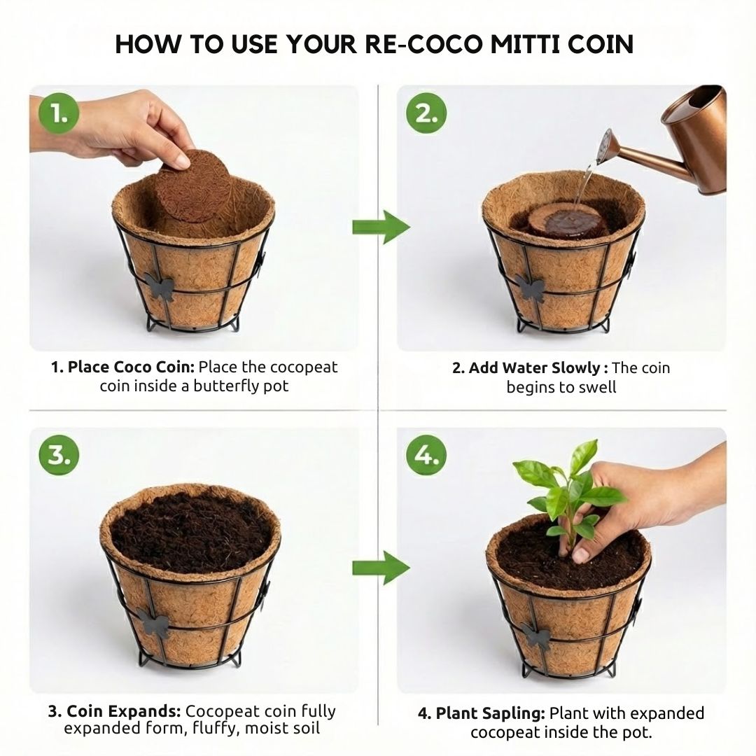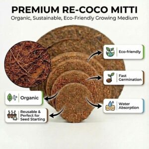 Re-Coco Mitti – Coco Peat Coins are the simplest, cleanest, and most eco-friendly way to start your planting journey. Made from 100% natural coconut husk fibers, these lightweight coins expand into soft, nutrient-rich coco peat when water is added—creating the perfect medium for seed germination, nursery planting, and educational kits.